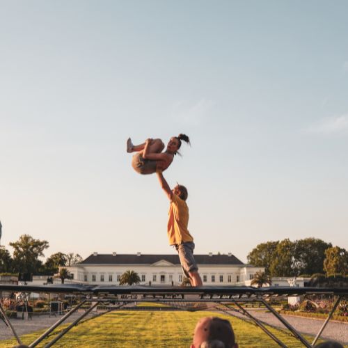 Zwei Akrobaten entdecken das Trampolin als ein spielerisches Objekt und die unendlich vielen