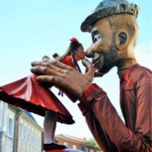 Ein riesiger Puppenmann tanzt im Zusammenspiel mit der Ballerina Atharina.